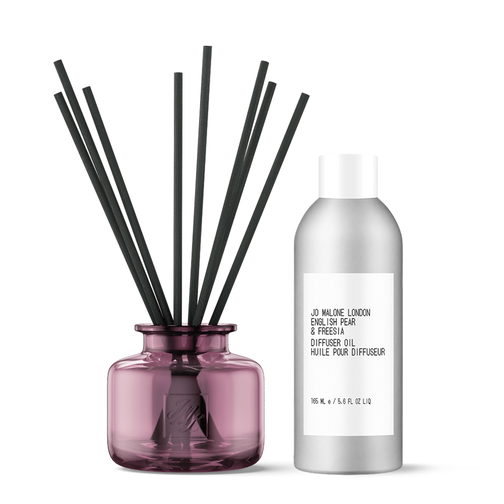 宝石のように美しい色合いのディフューザー容器と、イングリッシュ ペアー & フリージア ディフューザー オイル(リフィル)のセット。