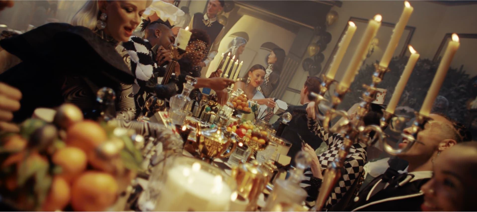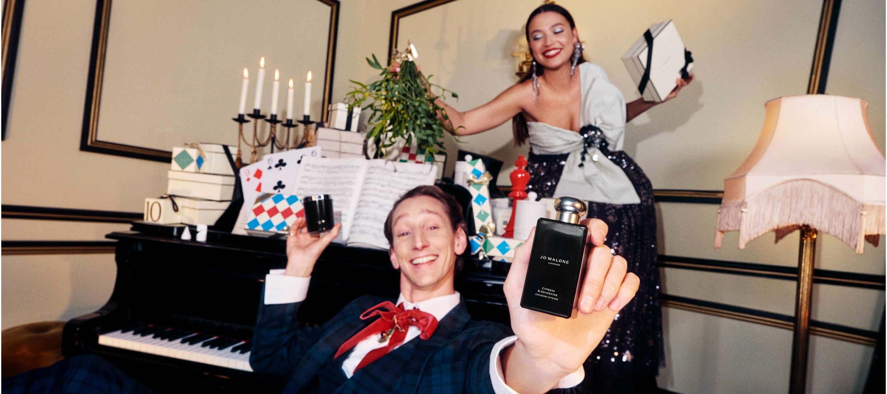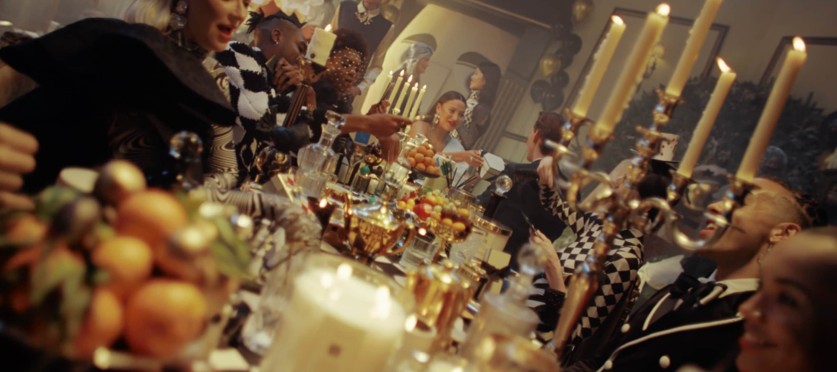 香りをめぐって視線が集まり、贈り物が手から手へと渡る、華やかで心躍るフェスティブなひととき。