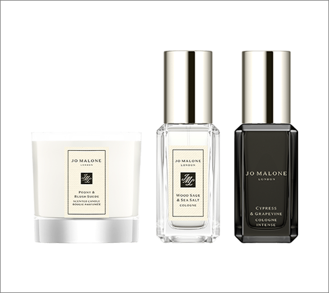 Jo Malone London bestselling home candle 200g, deluxe candle 600g and 100ml cologne topped with a pink cap.