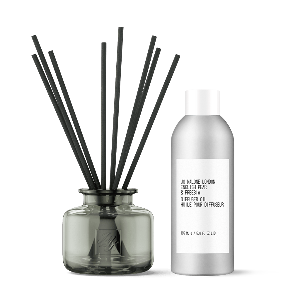 宝石のように美しい色合いのディフューザー容器と、イングリッシュ ペアー & フリージア ディフューザー オイル(リフィル)のセット。